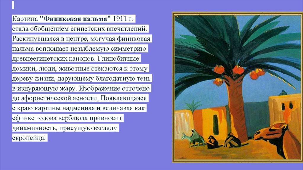 Картина "Финиковая пальма" 1911 г.стала обобщением египетских впечатлений.