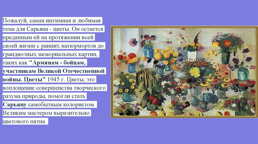 Пожалуй, самая интимная и любимаятема для Сарьяна - цветы. Он остается