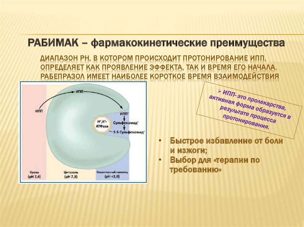 РАБИМАК – фармакокинетические преимуществаДИАПАЗОН РН, В КОТОРОМ ПРОИСХОДИТ ПРОТОНИРОВАНИЕ ИПП,