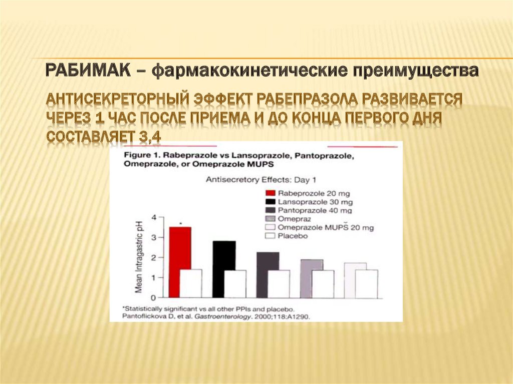 РАБИМАК – фармакокинетические преимуществаАНТИСЕКРЕТОРНЫЙ ЭФФЕКТ РАБЕПРАЗОЛА РАЗВИВАЕТСЯ