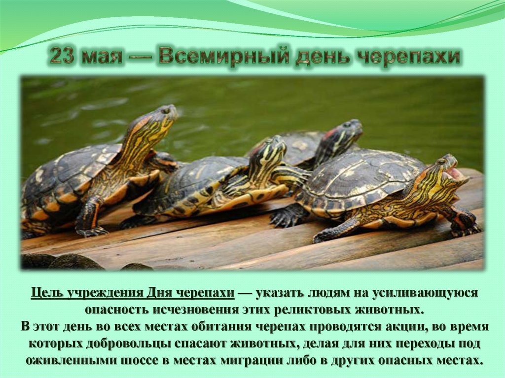 Цель учреждения Дня черепахи — указать людям на усиливающуюсяопасность исчезновения этих реликтовых животных.