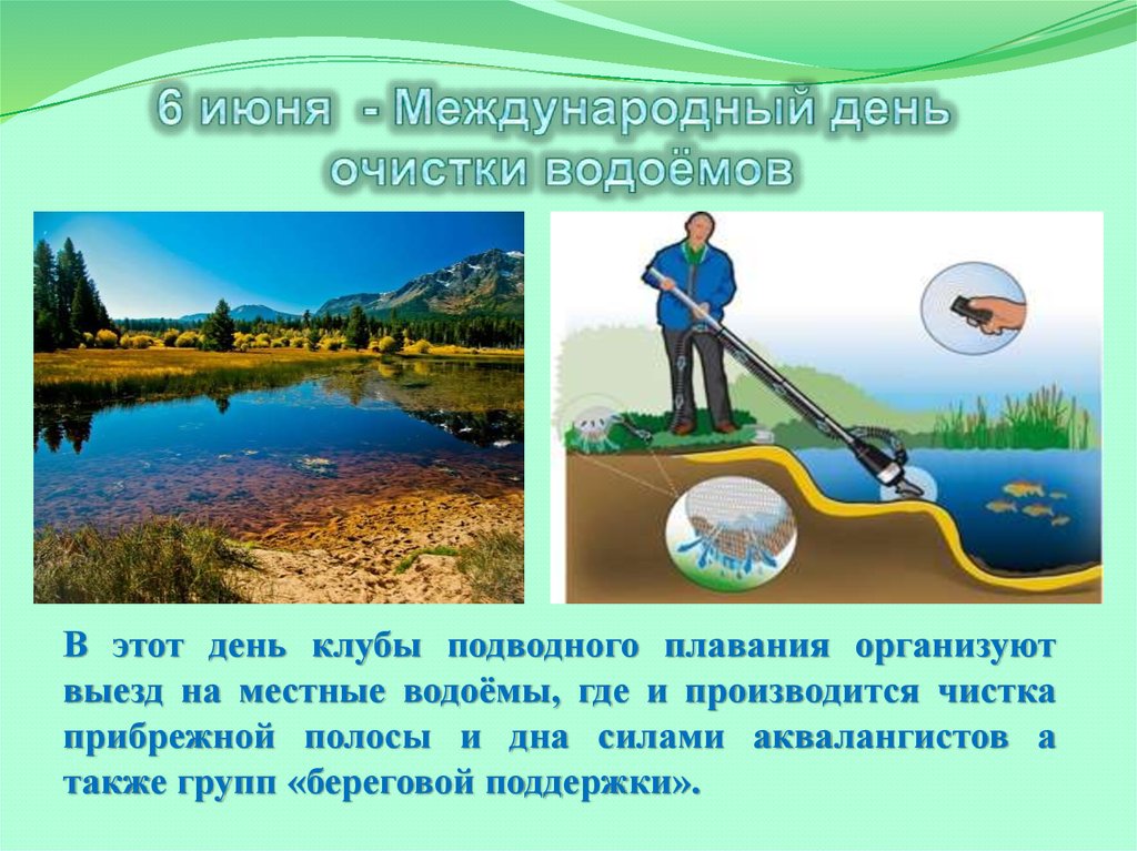 В этот день клубы подводного плавания организуютвыезд на местные водоёмы, где и производится чистка