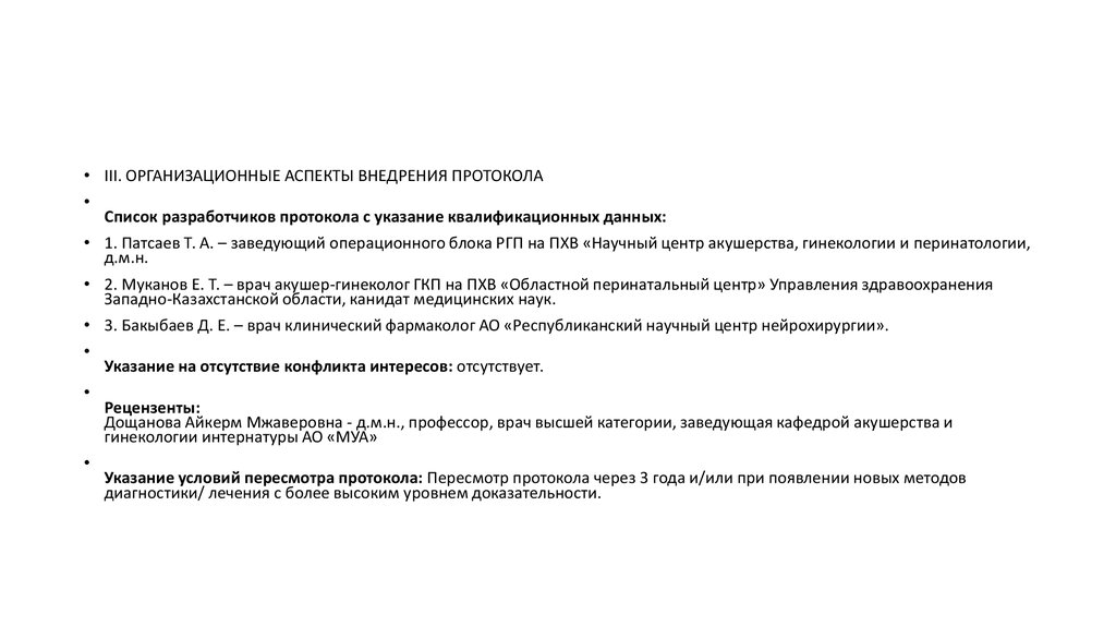 • III. ОРГАНИЗАЦИОННЫЕ АСПЕКТЫ ВНЕДРЕНИЯ ПРОТОКОЛАСписок разработчиков протокола с указание квалификационных данных: