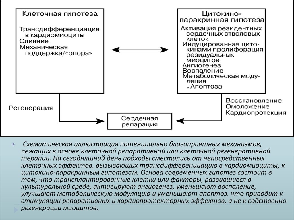 Схематическая иллюстрация потенциально благоприятных механизмов,лежащих в основе клеточной репаративной или клеточной регенеративной