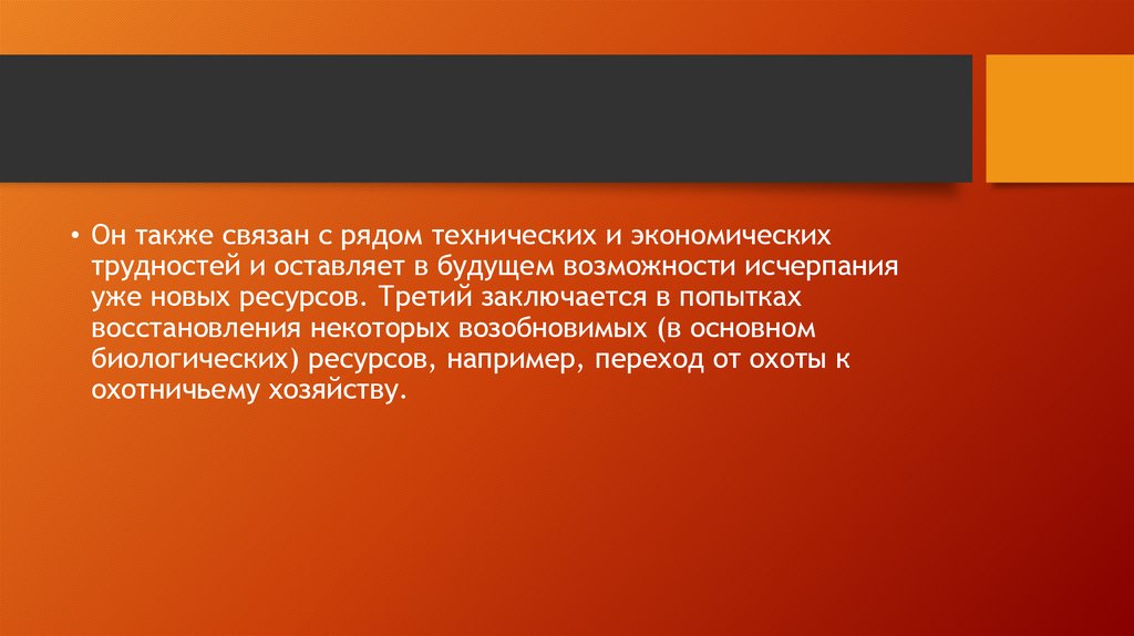 • Он также связан с рядом технических и экономическихтрудностей и оставляет в будущем возможности исчерпания
