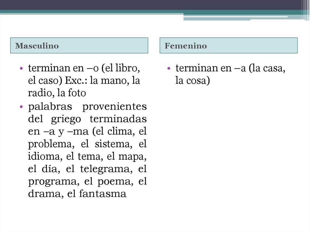 Masculino (más frecuente)• terminan en -e, -i, -u