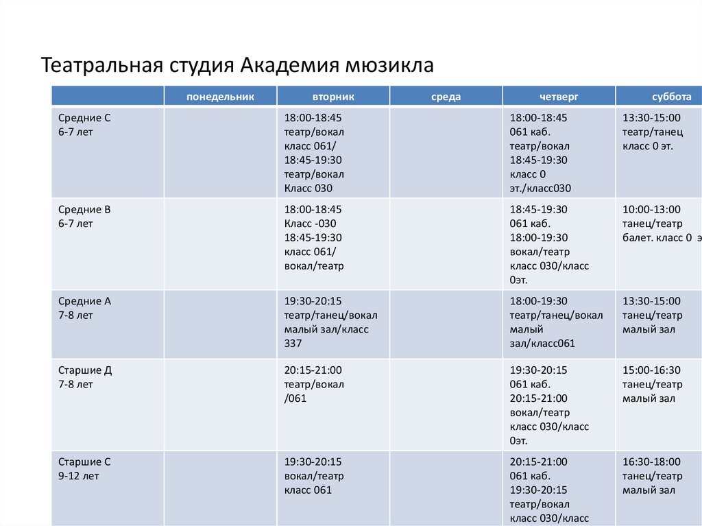 Театральная студия академия мюзикла. Расписание на 2019-2020 год
