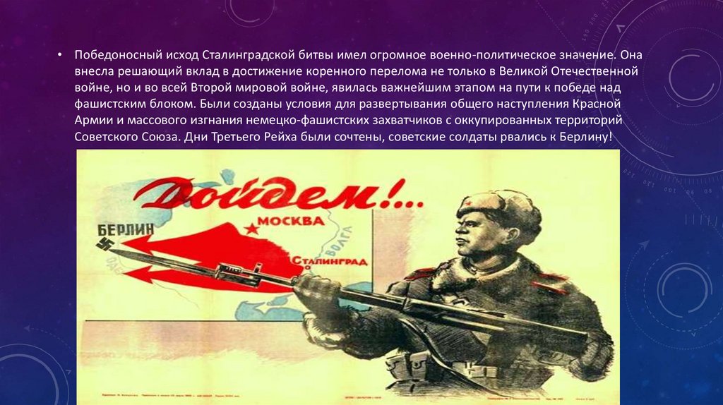 • Победоносный исход Сталинградской битвы имел огромное военно-политическое значение. Онавнесла решающий вклад в достижение коренного перелома не только в Великой Отечественной