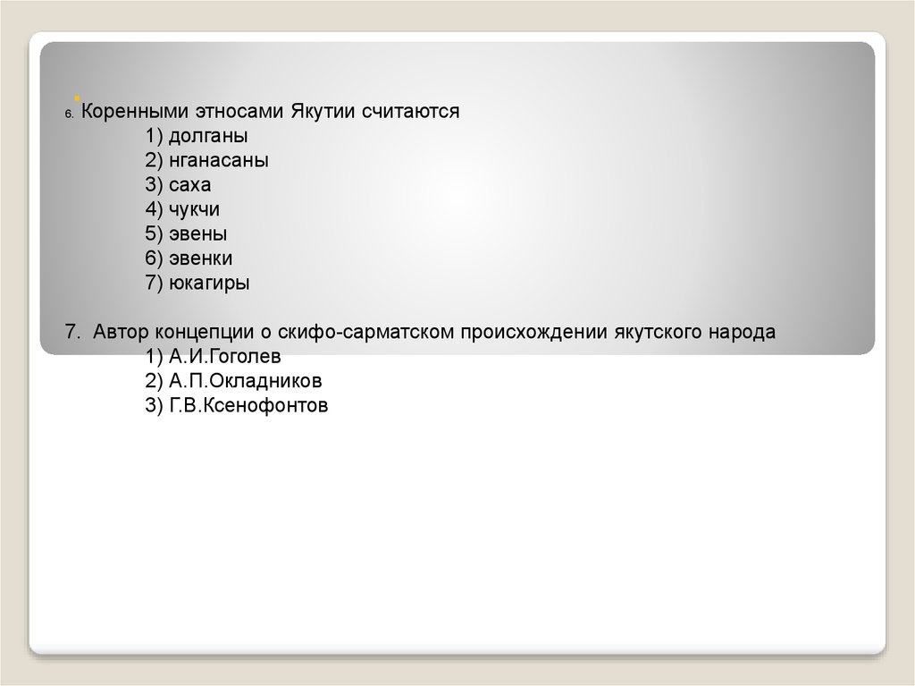 8. Основу формирования народа саха составили племена1) древнемонгольские