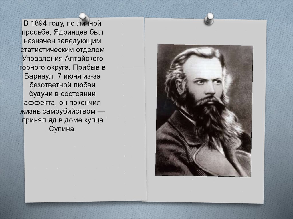 В 1894 году, по личнойпросьбе, Ядринцев был