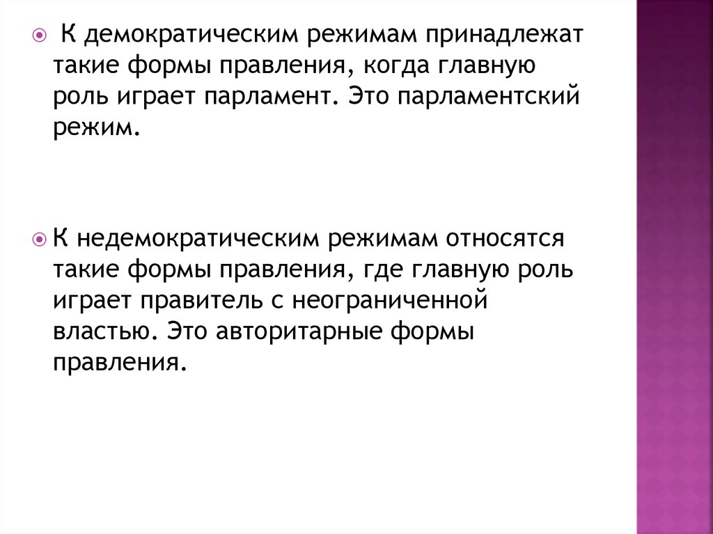 К демократическим режимам принадлежаттакие формы правления, когда главную