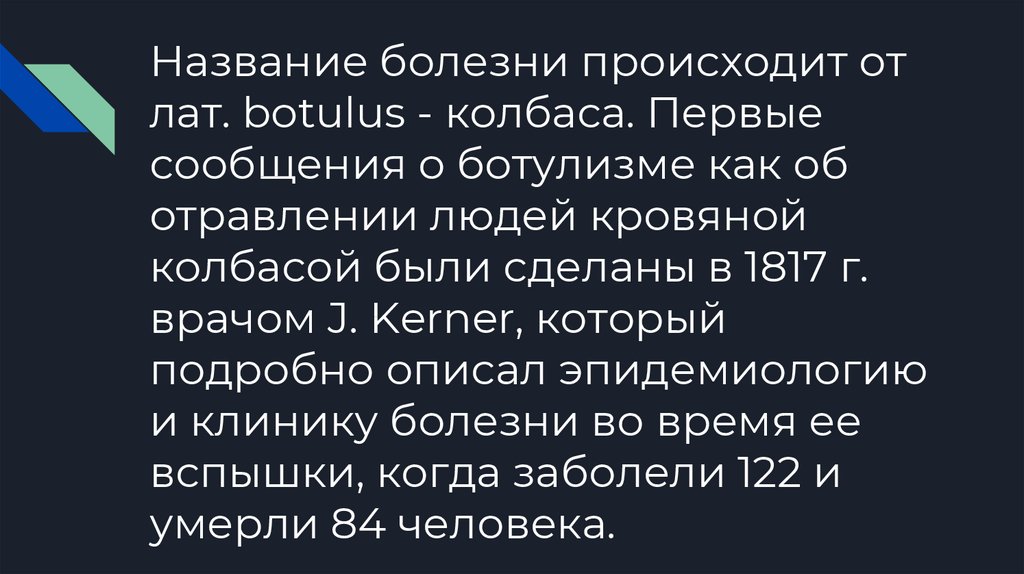 Название болезни происходит отлат. botulus - колбаса. Первые