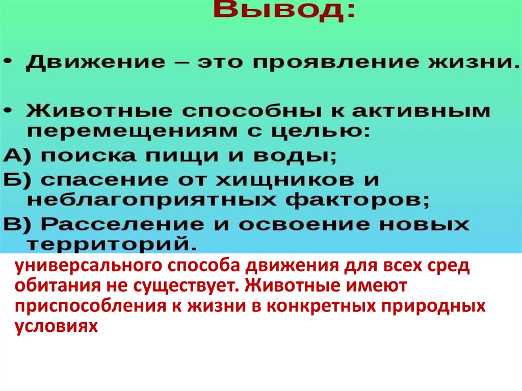• Вывод: универсального способа движениядля всех сред обитания не существует.