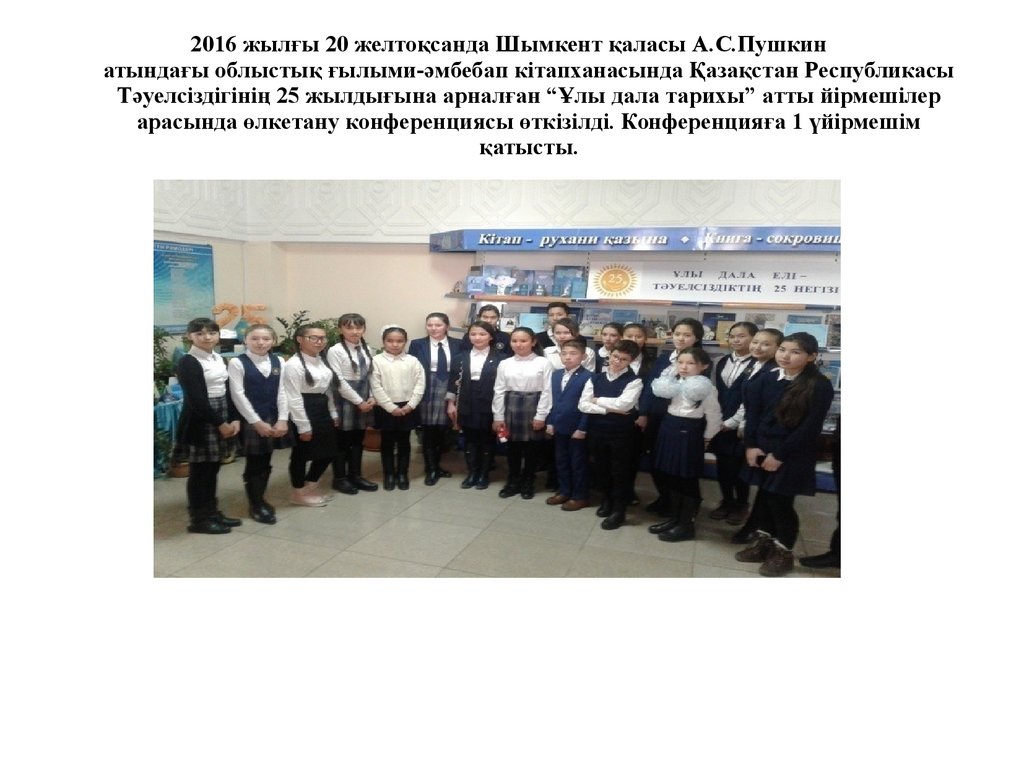 2016 жылғы 20 желтоқсанда Шымкент қаласы А.С.Пушкинатындағы облыстық ғылыми-әмбебап кітапханасында Қазақстан Республикасы
