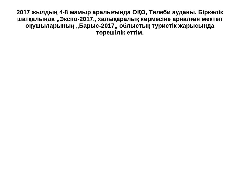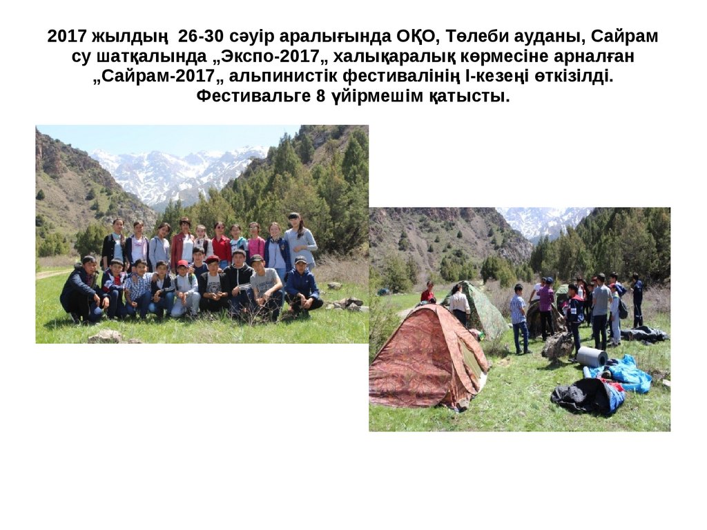 2017 жылдың 26-30 сәуір аралығында ОҚО, Төлеби ауданы, Сайрамсу шатқалында „Экспо-2017„ халықаралық көрмесіне арналған