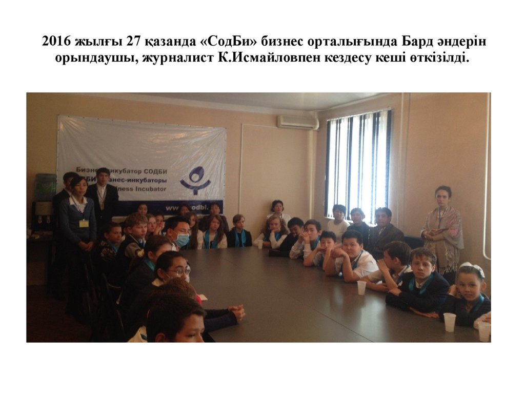 2016 жылғы 27 қазанда «СодБи» бизнес орталығында Бард әндерінорындаушы, журналист К.Исмайловпен кездесу кеші өткізілді.