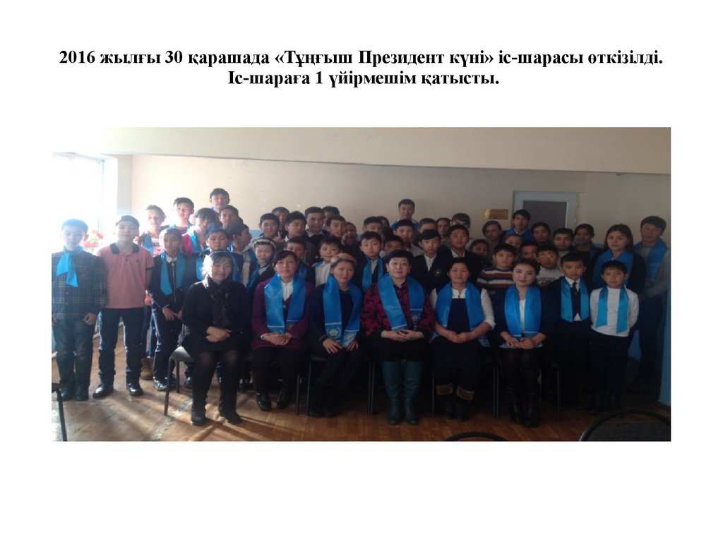 2016 жылғы 30 қарашада «Тұңғыш Президент күні» іс-шарасы өткізілді.Іс-шараға 1 үйірмешім қатысты.