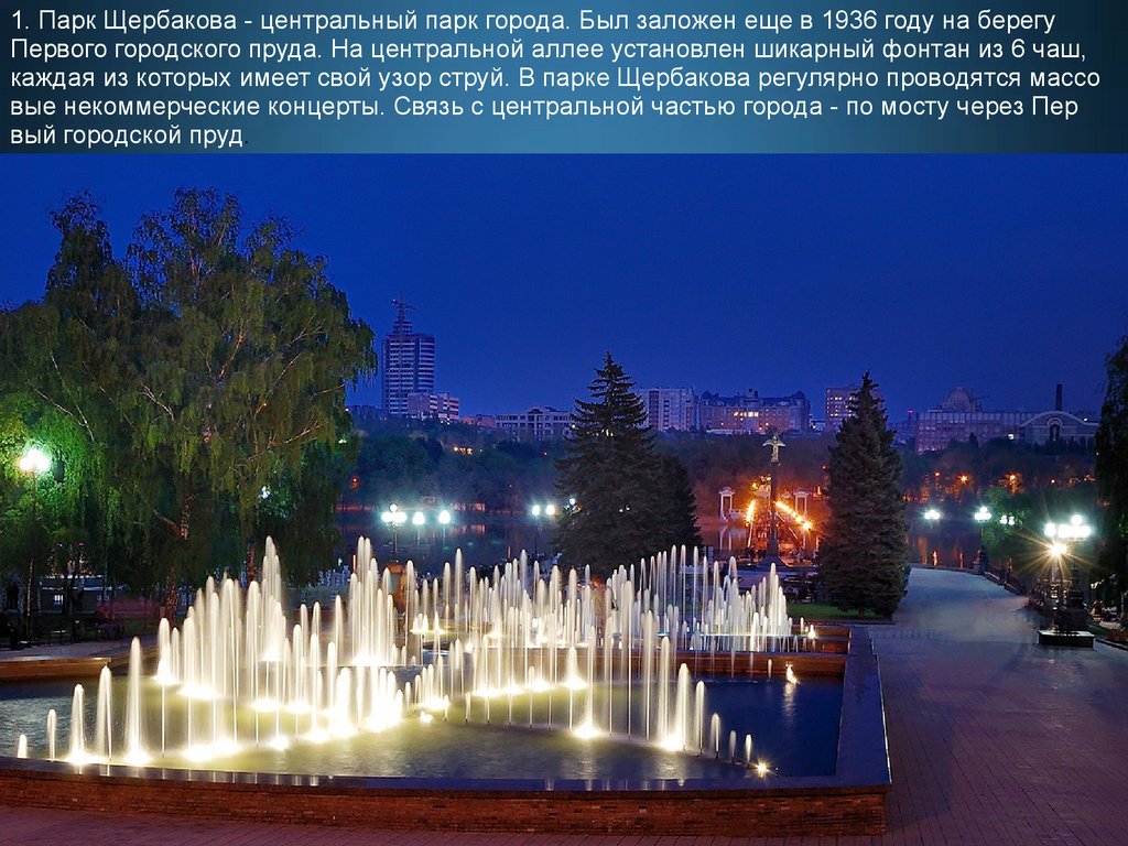 1. Парк Щербакова - центральный парк города. Был заложен еще в 1936 году на берегуПервого городского пруда. На центральной аллее установлен шикарный фонтан из 6 чаш,