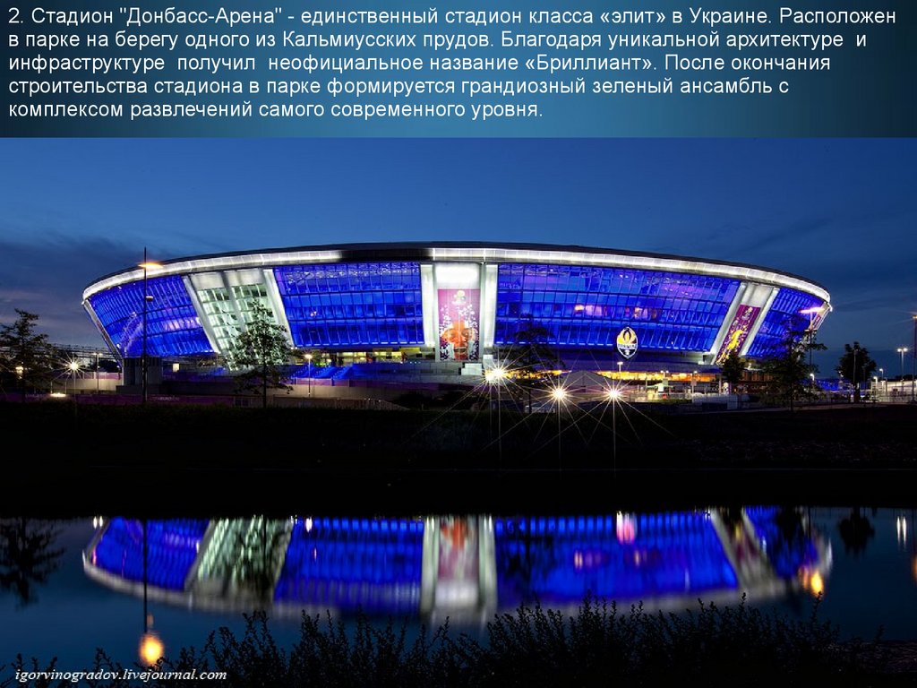 2. Стадион "Донбасс-Арена" - единственный стадион класса «элит» в Украине. Расположенв парке на берегу одного из Кальмиусских прудов. Благодаря уникальной архитектуре и