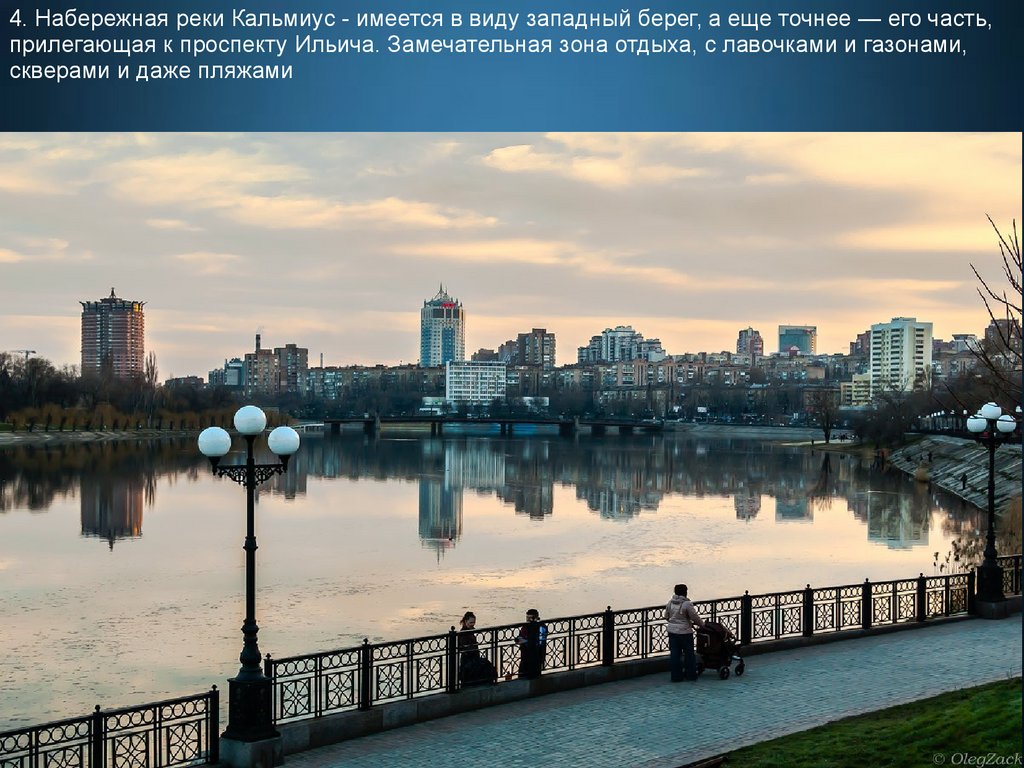 4. Набережная реки Кальмиус - имеется в виду западный берег, а еще точнее — его часть,прилегающая к проспекту Ильича. Замечательная зона отдыха, с лавочками и газонами,