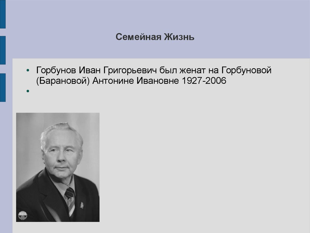 Семейная ЖизньГорбунов Иван Григорьевич был женат на Горбуновой
