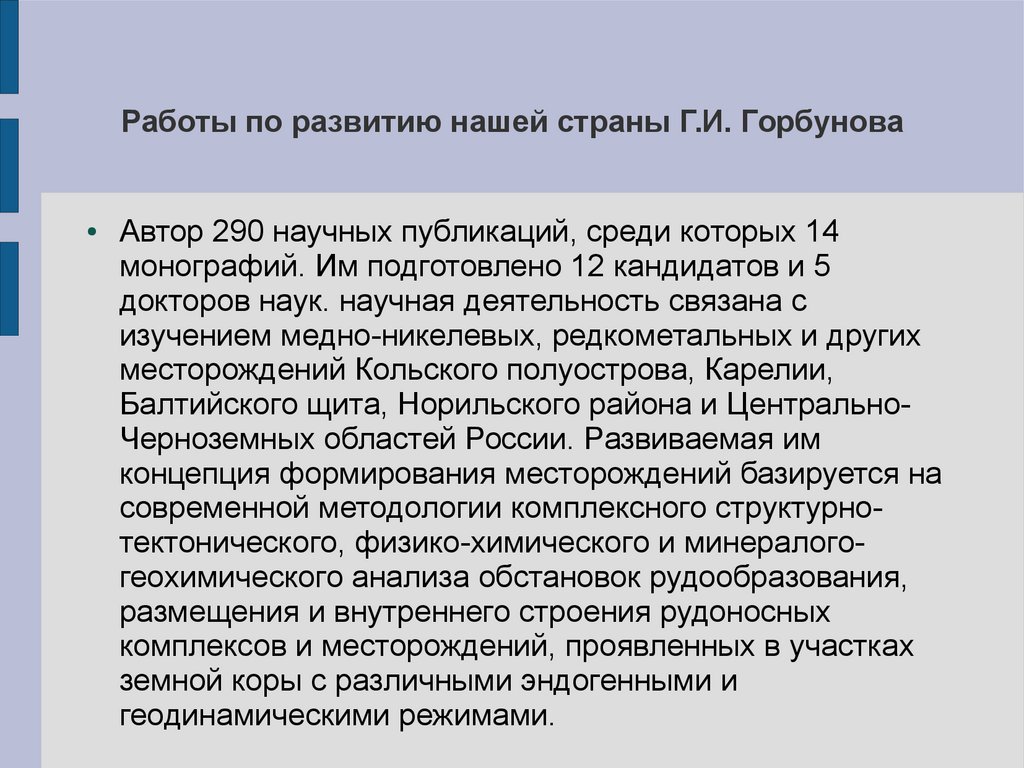 Работы по развитию нашей страны Г.И. ГорбуноваАвтор 290 научных публикаций, среди которых 14