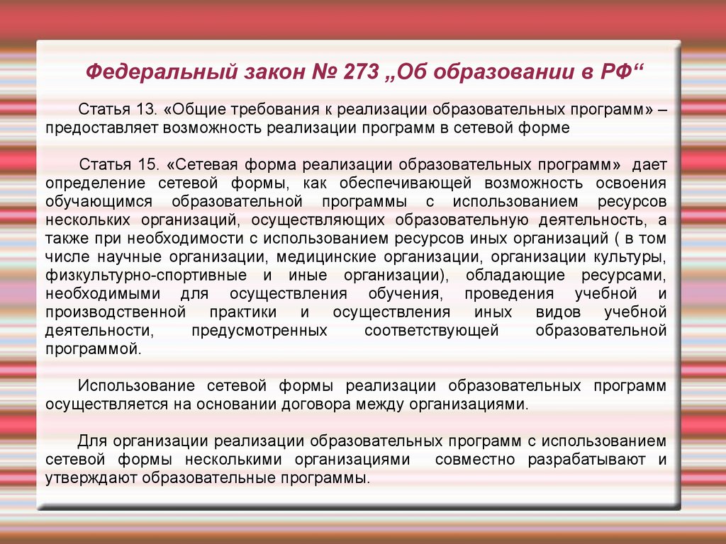 Статья 15. «Сетевая форма реализации образовательных программ» дает