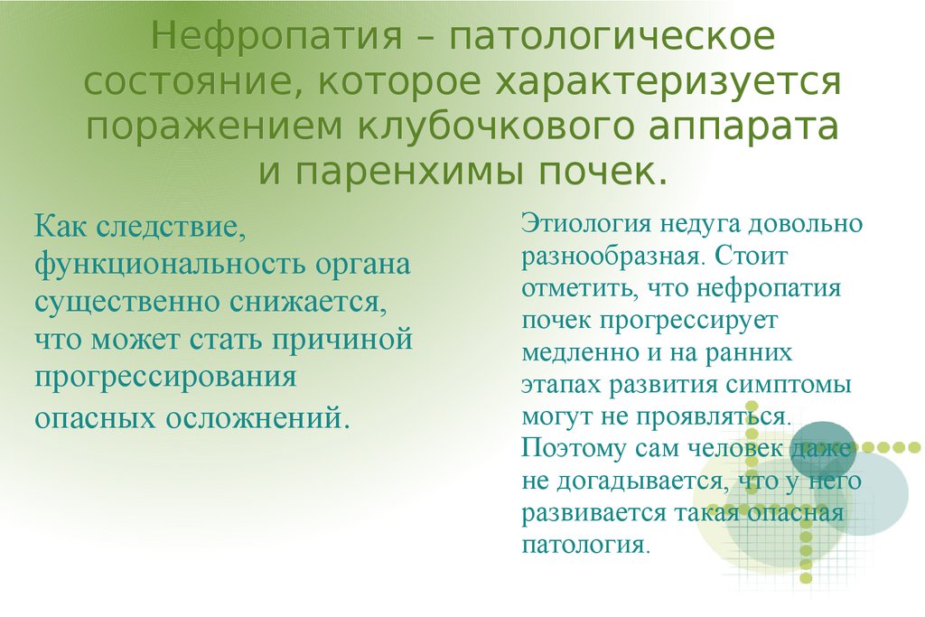 Нефропатия – патологическое состояние, которое характеризуется поражением клубочкового аппарата и паренхимы почек
