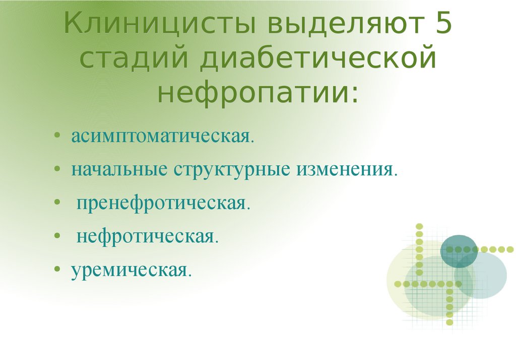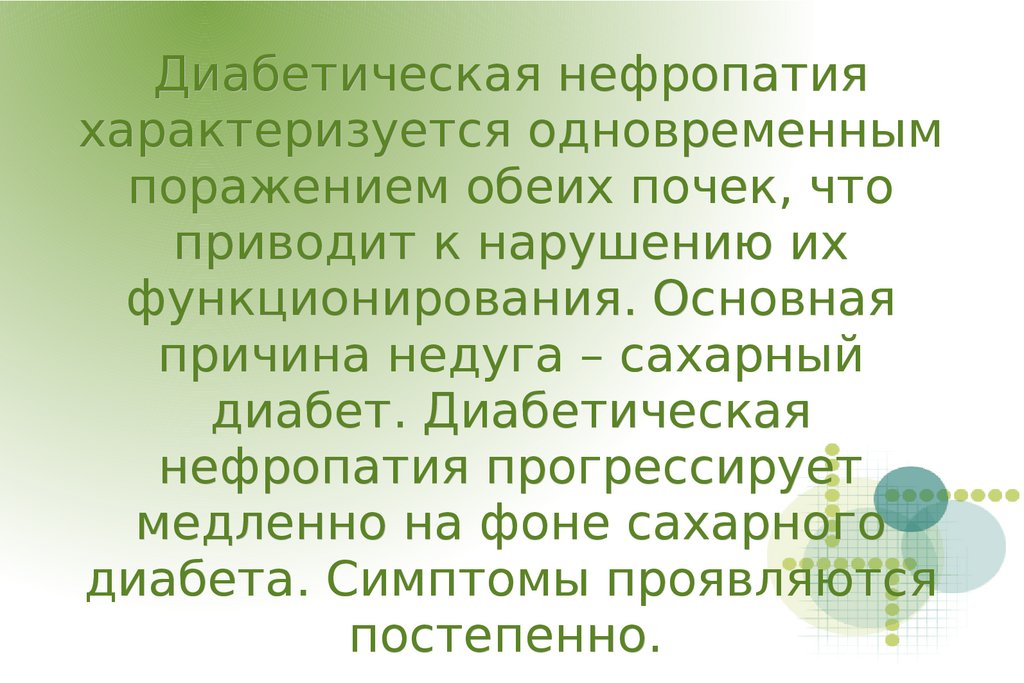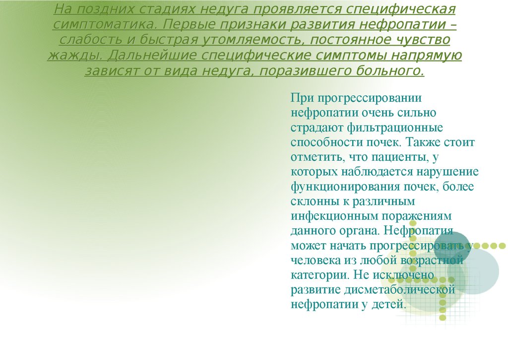 На поздних стадиях недуга проявляется специфическаясимптоматика. Первые признаки развития нефропатии –