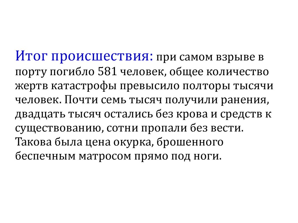 Итог происшествия: при самом взрыве впорту погибло 581 человек, общее количество
