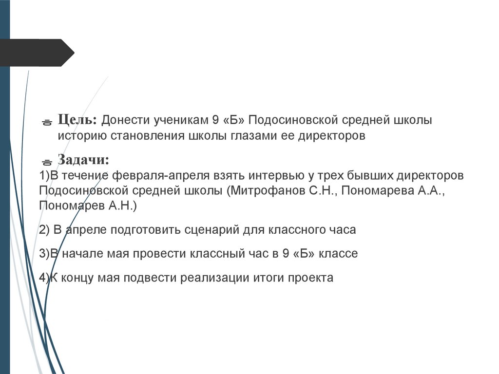 Цель: Донести ученикам 9 «Б» Подосиновской средней школыисторию становления школы глазами ее директоров