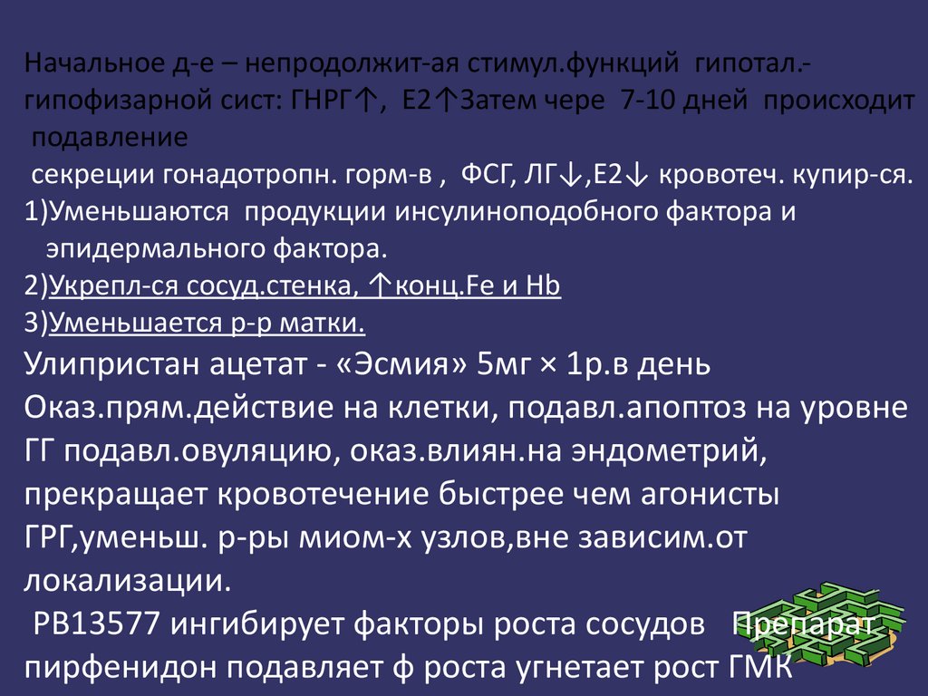 Начальное д-е – непродолжит-ая стимул.функций гипотал.гипофизарной сист: ГНРГ↑, Е2↑Затем чере 7-10 дней происходитподавление