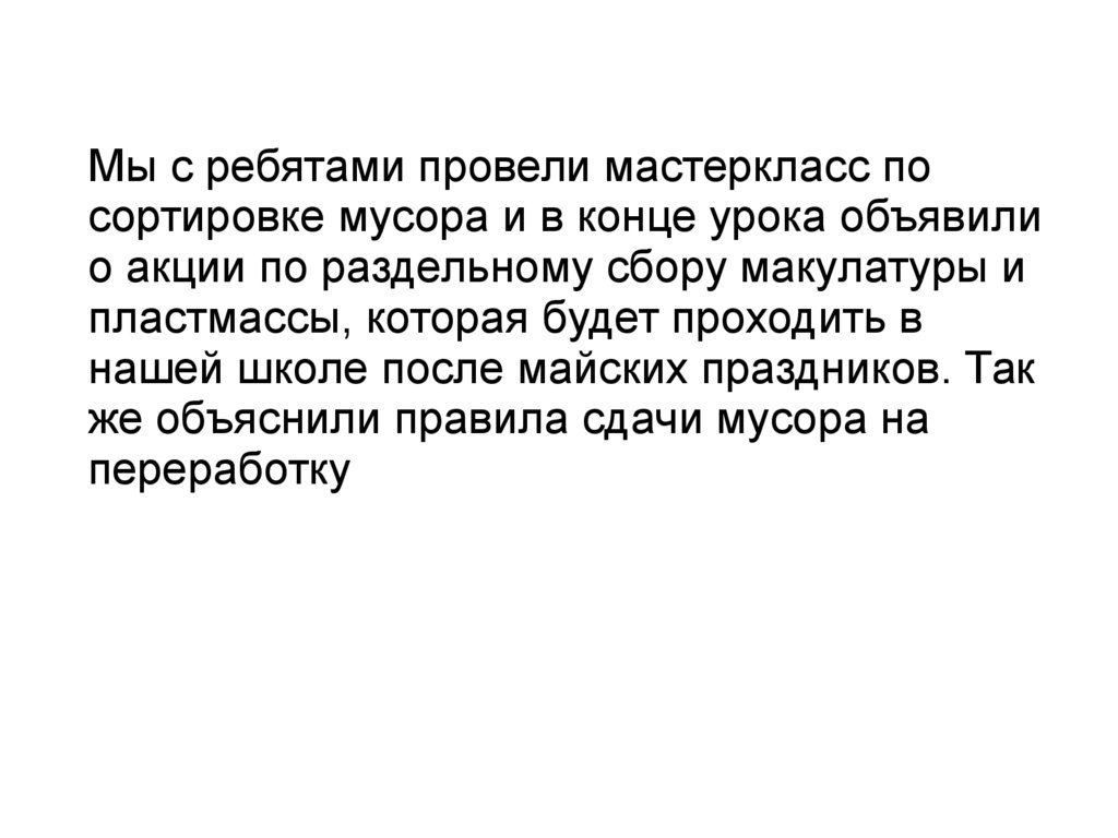 Мы с ребятами провели мастеркласс посортировке мусора и в конце урока объявили