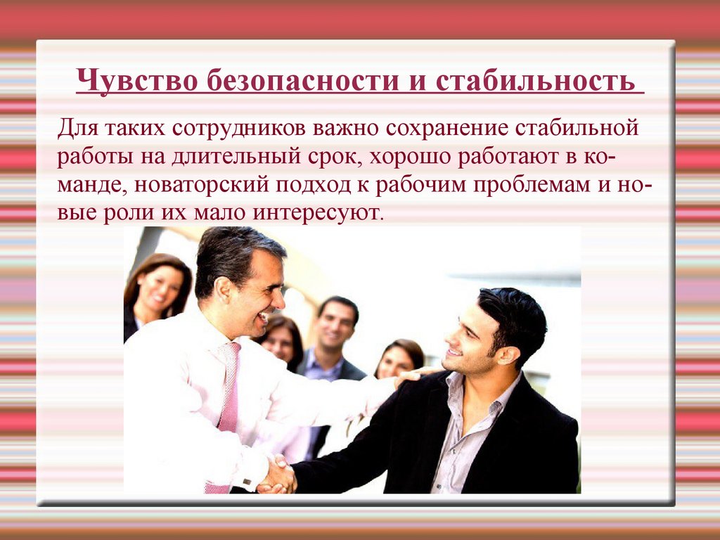 Чувство безопасности и стабильностьДля таких сотрудников важно сохранение стабильной