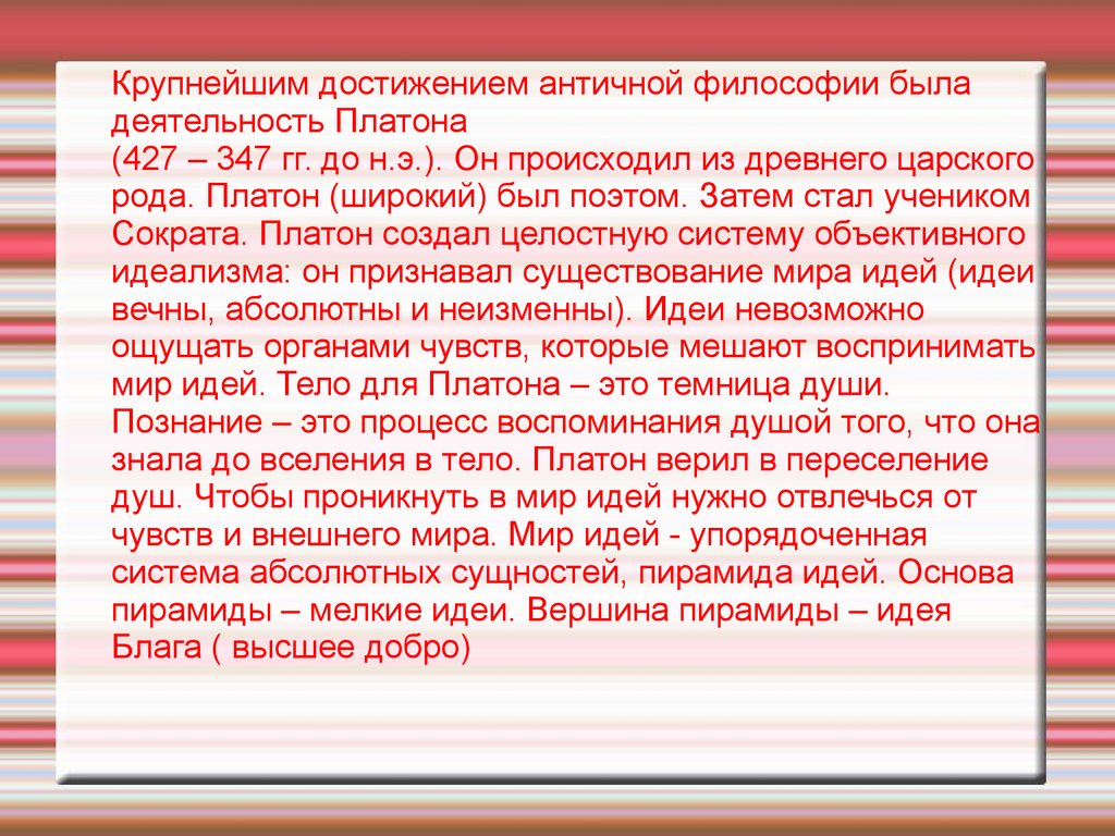 Крупнейшим достижением античной философии быладеятельность Платона