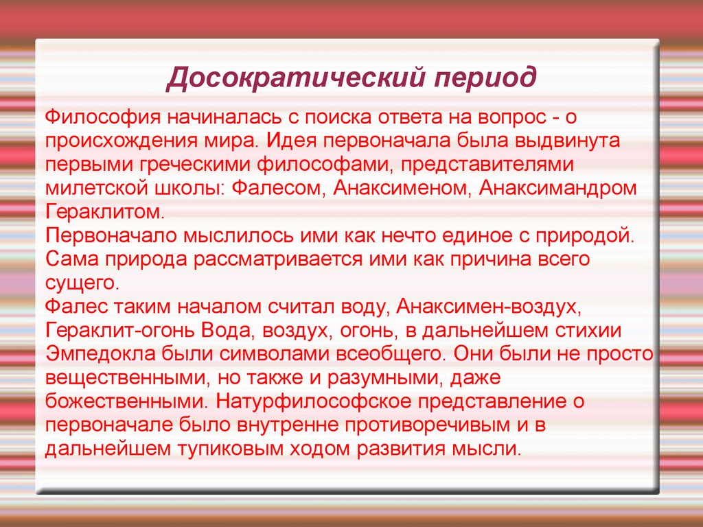 Досократический периодФилософия начиналась с поиска ответа на вопрос - о