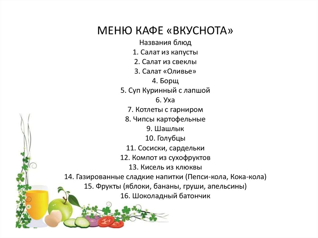 МЕНЮ КАФЕ «ВКУСНОТА»Названия блюд