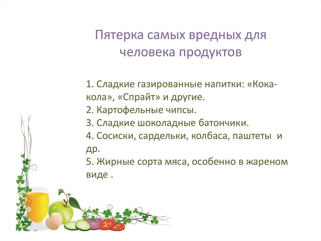 1. Сладкие газированные напитки: «Кокакола», «Спрайт» и другие.