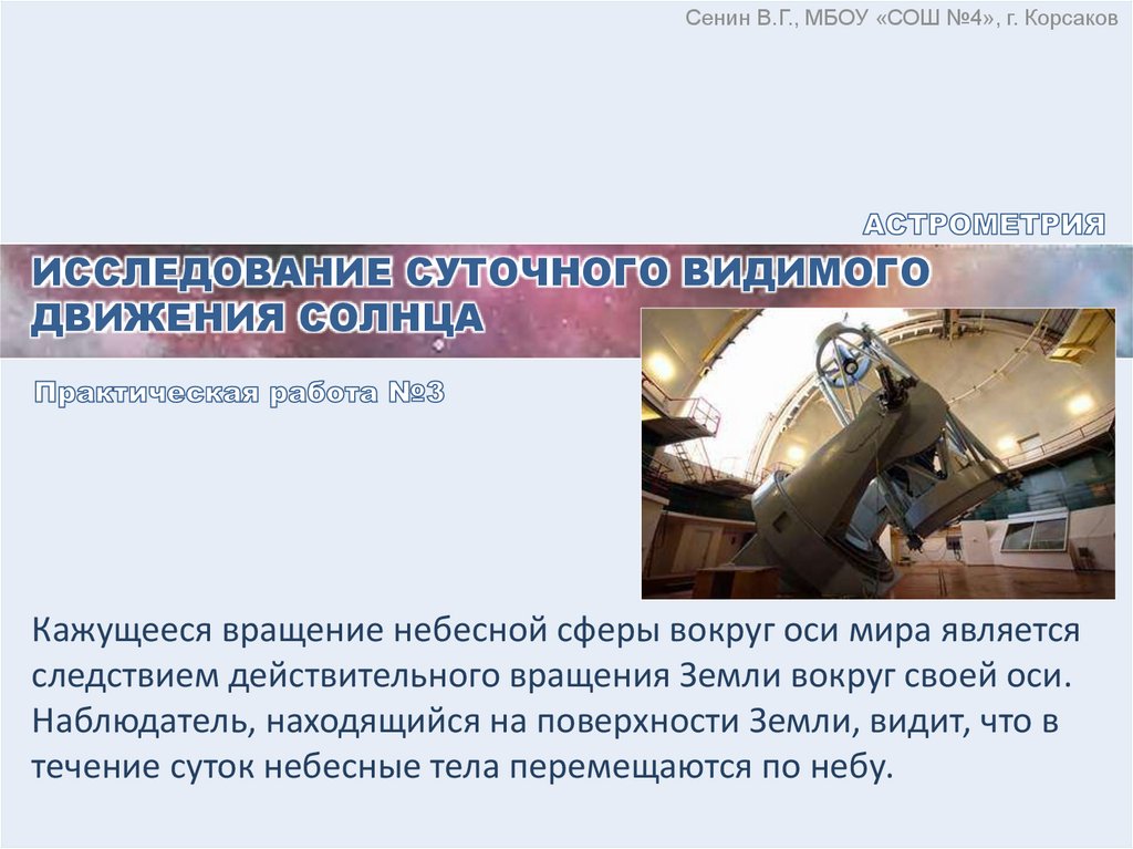 Сенин В.Г., МБОУ «СОШ №4», г. КорсаковИССЛЕДОВАНИЕ СУТОЧНОГО ВИДИМОГО