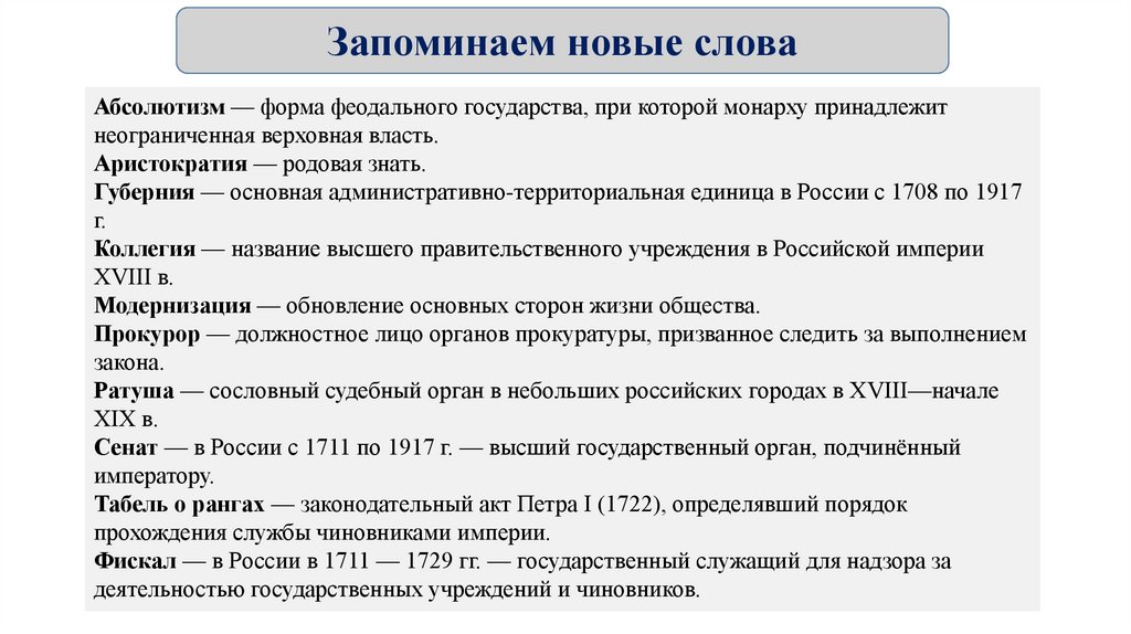 Запоминаем новые словаАбсолютизм — форма феодального государства, при которой монарху принадлежит