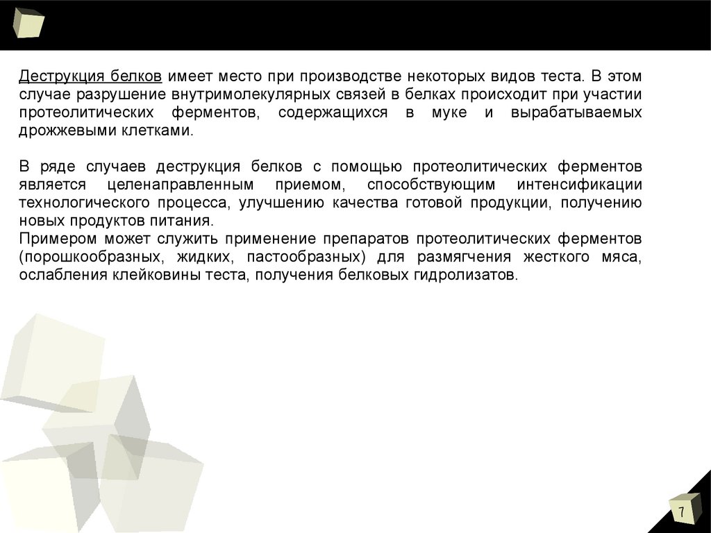 Деструкция белков имеет место при производстве некоторых видов теста. В этомслучае разрушение внутримолекулярных связей в белках происходит при участии