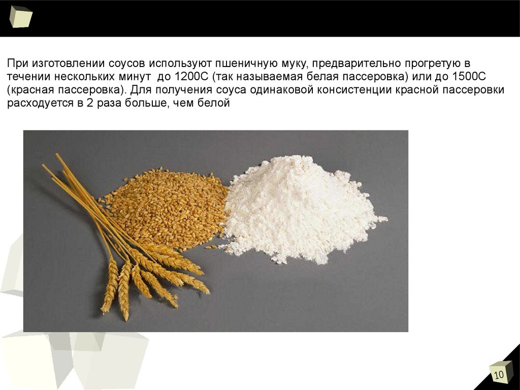 Например, при изготовлении соусов используют пшеничную муку, предварительно