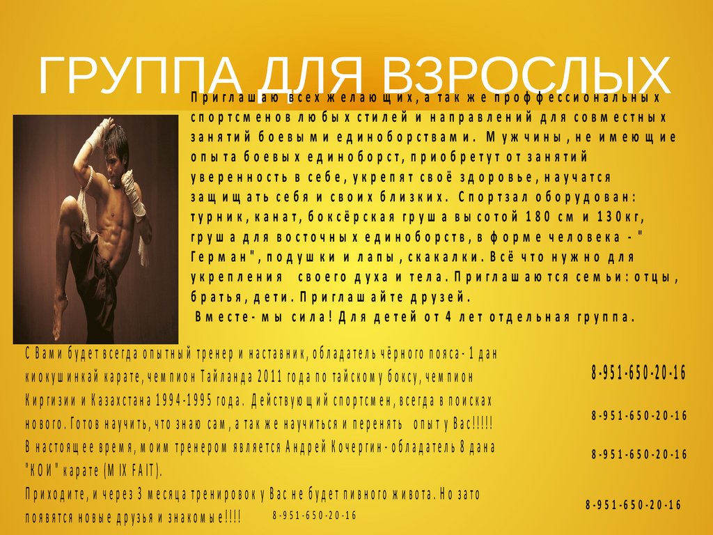 ГРУППА ДЛЯ ВЗРОСЛЫХПриглашаю всех желающих, а так же проффессиональных спортсменов любых стилей и