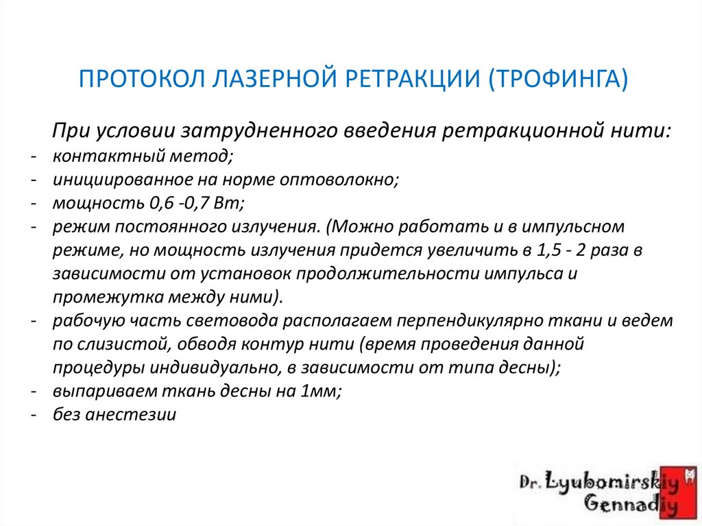 ПРОТОКОЛ ЛАЗЕРНОЙ РЕТРАКЦИИ (ТРОФИНГА)После установки ретракционной нити производят