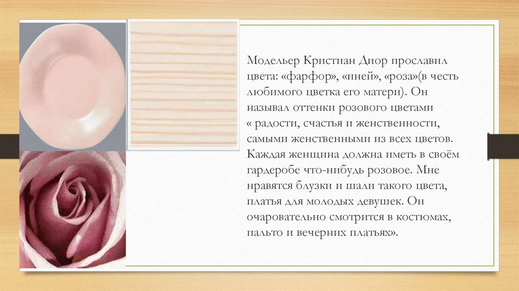 • Модельер Кристиан Диор прославилцвета: «фарфор», «иней», «роза»(в честь