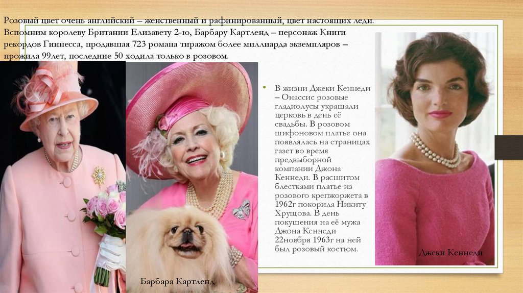 Розовый цвет очень английский – женственный и рафинированный, цвет настоящих леди.Вспомним королеву Британии Елизавету 2-ю, Барбару Картленд – персонаж Книги