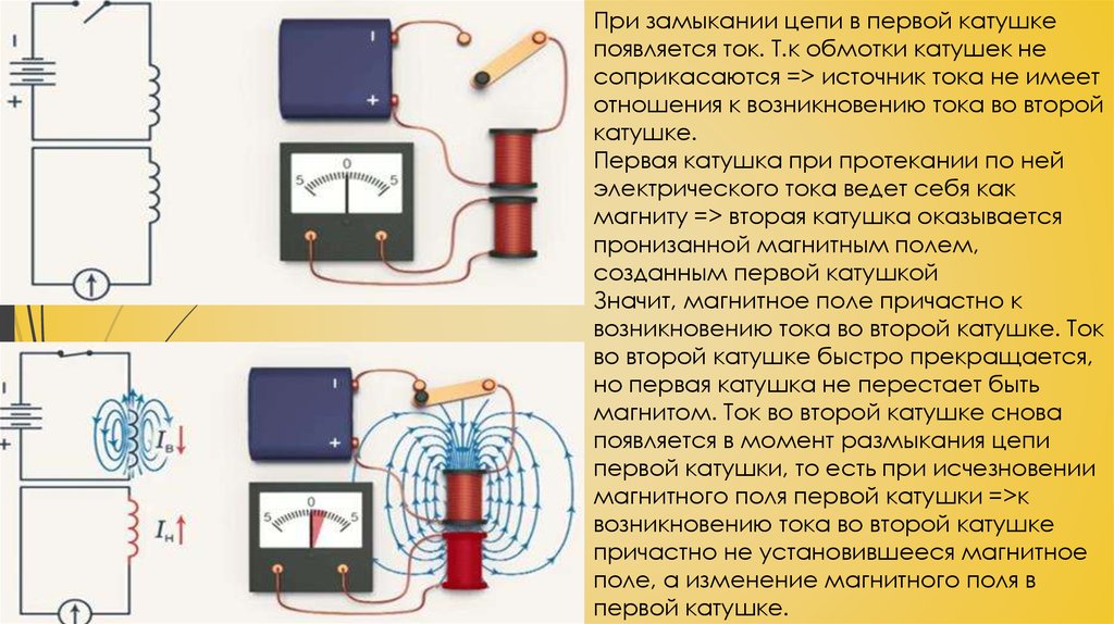 При замыкании цепи в первой катушкепоявляется ток. Т.к обмотки катушек не