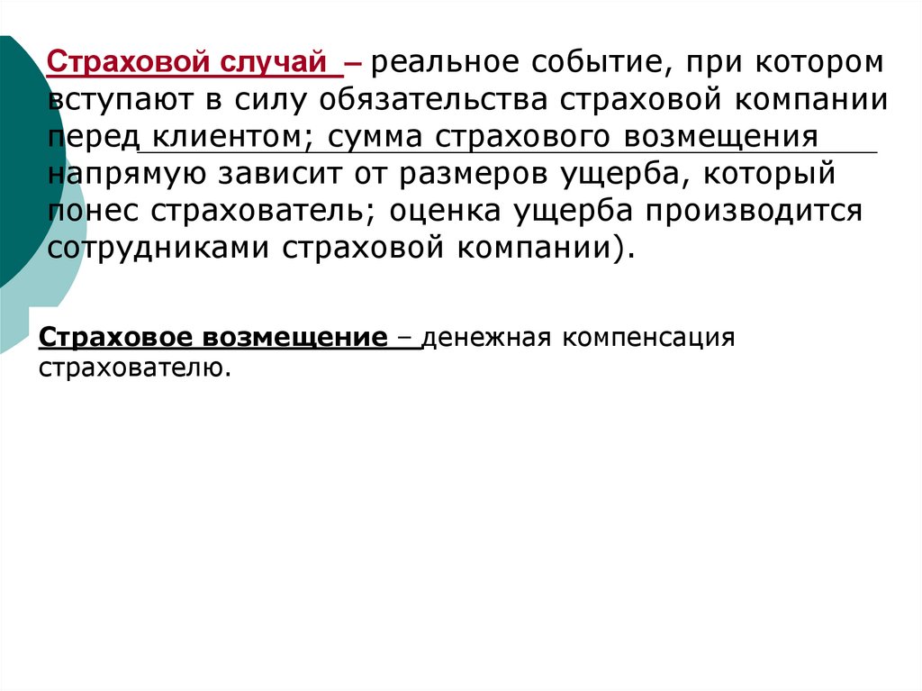 Страховой случай – реальное событие, при которомвступают в силу обязательства страховой компании