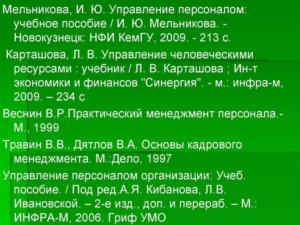 Мельникова, И. Ю. Управление персоналом:учебное пособие / И. Ю. Мельникова. Новокузнецк: НФИ КемГУ, 2009. - 213 с.