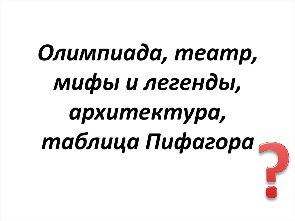1. Олимпиада, театр, мифы и легенды, архитектура, таблица Пифагора